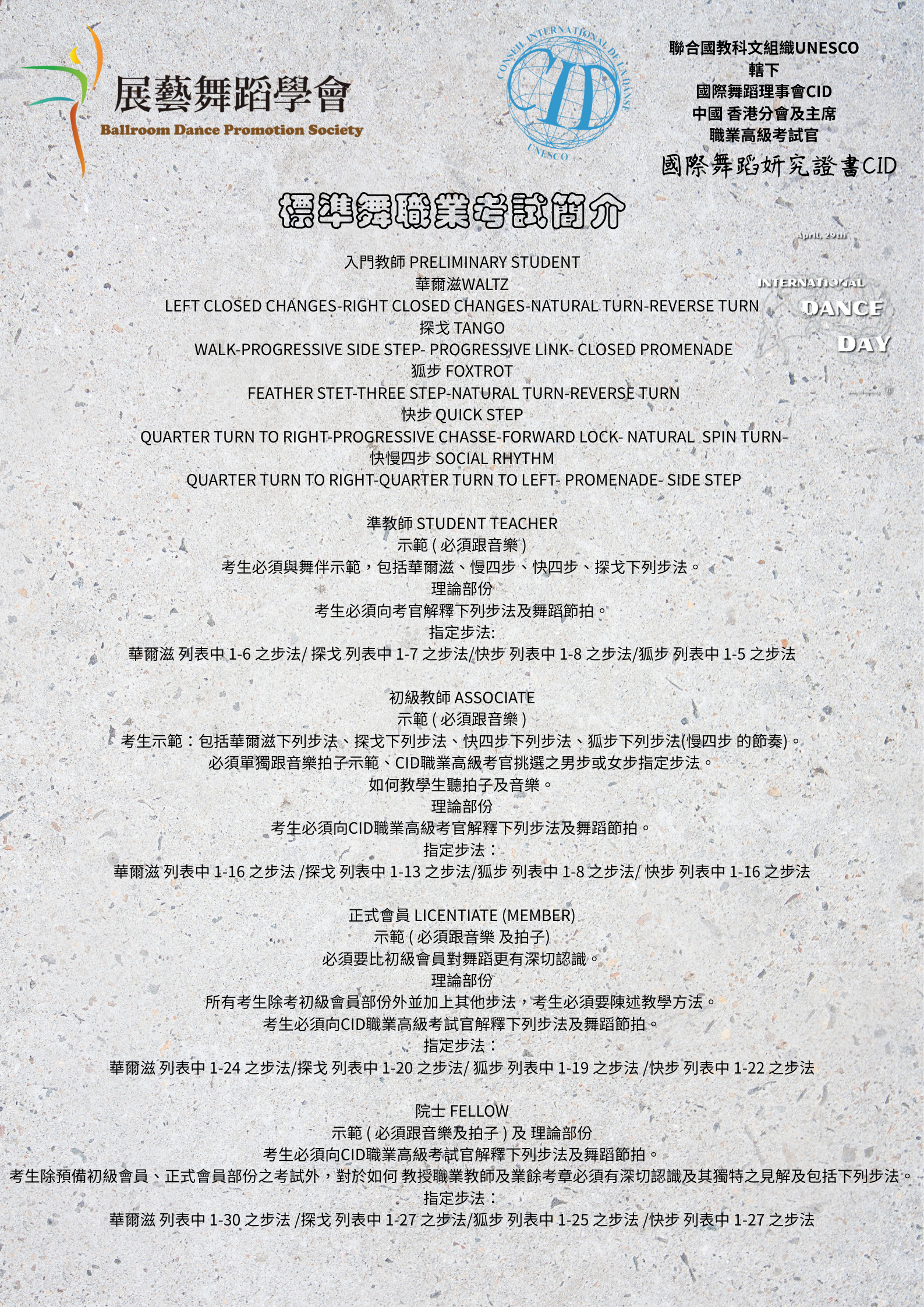 國際舞蹈理事會 CID 國際職業妍究證書 標準舞考試 程序簡介
