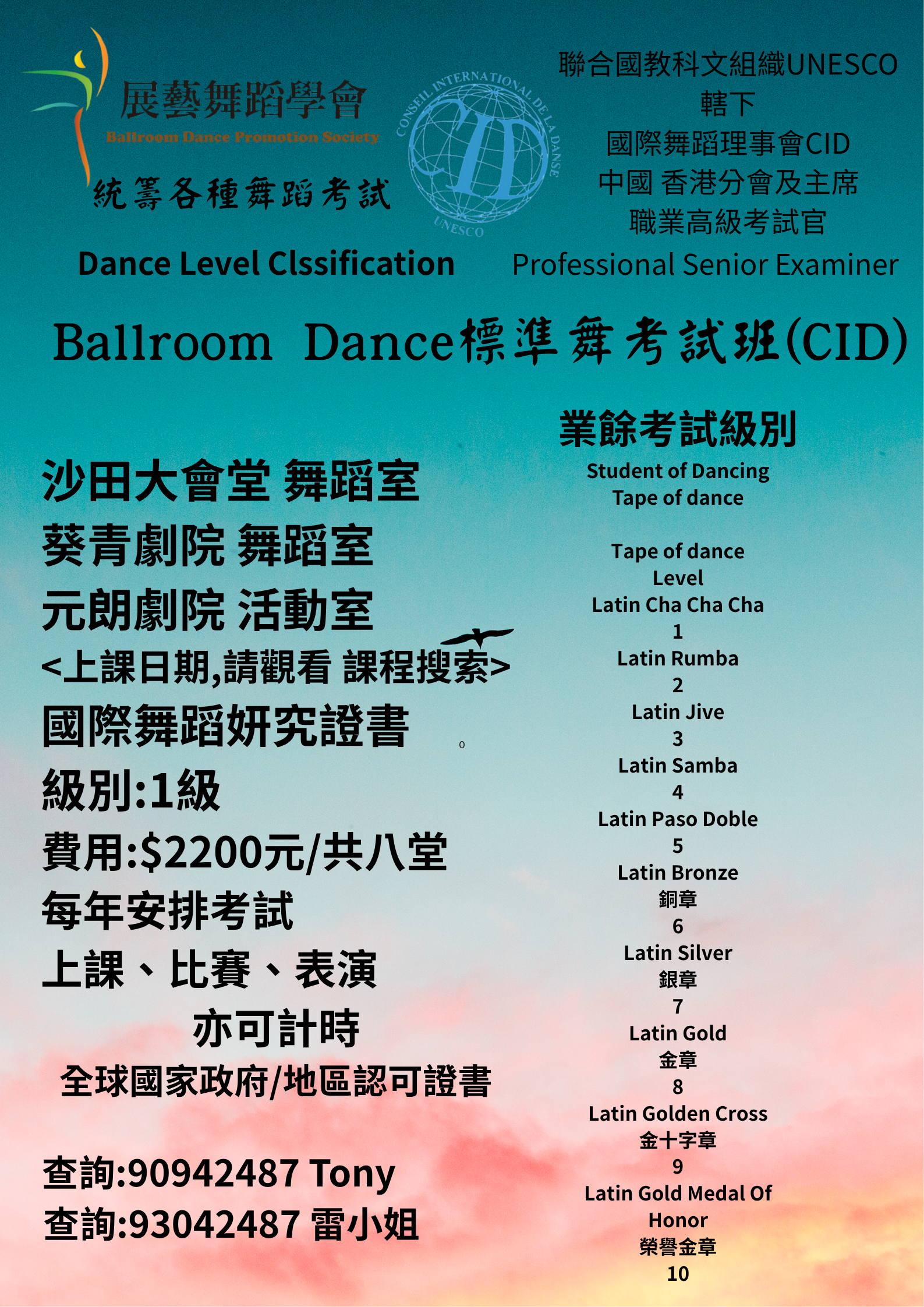 拉丁舞及標準舞 職業及業餘各種舞蹈 CID 國際證書課程,收費表